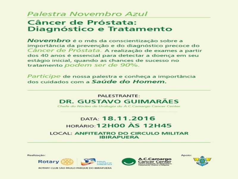 Sexta-feira, dia 18 de Novembro, das 12:00h às 12:45h, no Anfiteatro do Clube Círculo Militar de São Paulo, o RCSP Parque do Ibirapuera promoverá uma palestra muito esclarecedora sobre o Câncer de Próstata, seu Diagnóstico e Tratamento, com o Dr. Gustavo Guimarães, Membro Titular do Colégio Brasileiro de Cirurgiões, Membro da Sociedade Brasileira de Urologia e Membro da Sociedade Brasileira de Cancerologia.