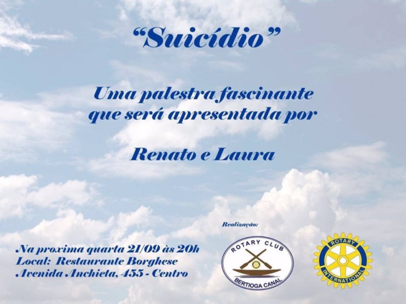 Com o objetivo de esclarecer a motivação do porque as pessoas chegam ao suicídio o RC Bertioga Canal realizou no dia 21 de setembro de 2016, uma bela palestra sobre o tema com a Palestrante Laura Xavier e representantes do CVV.
