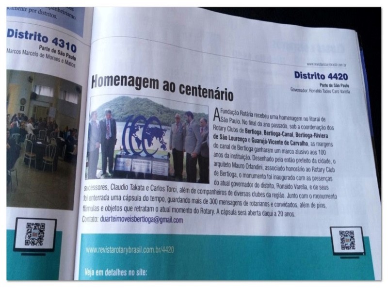 É com muita alegria que recebemos a Revista Rotary Brasil deste mês com a matéria da Inauguração do Monumento dos 100 Anos da Fundação Rotária em destaque no distrito 4420.
