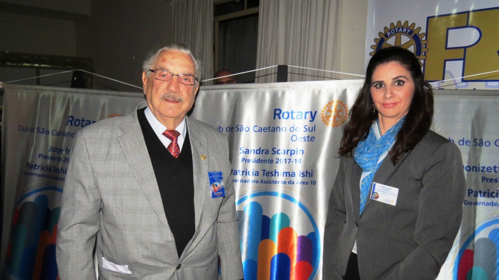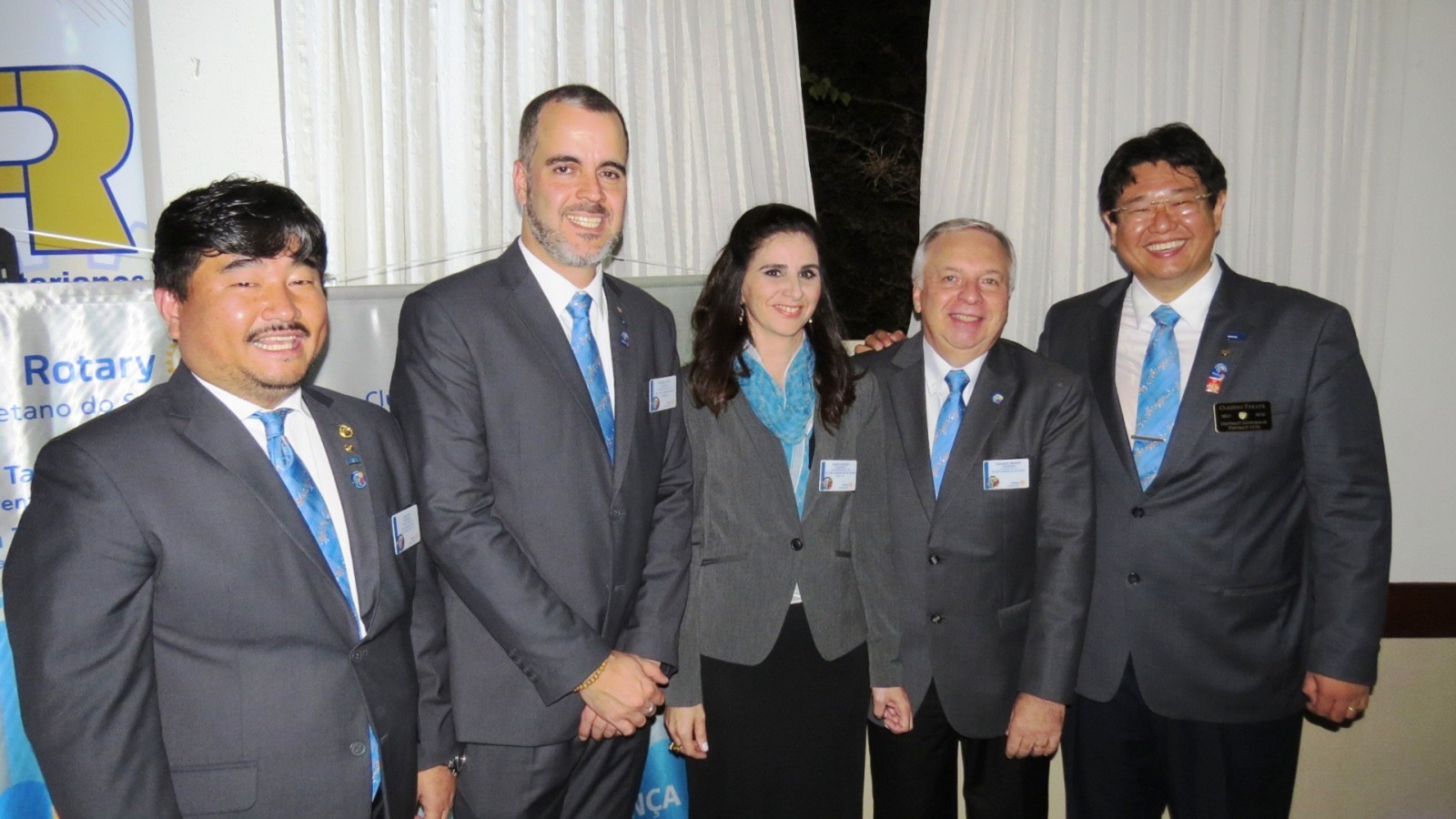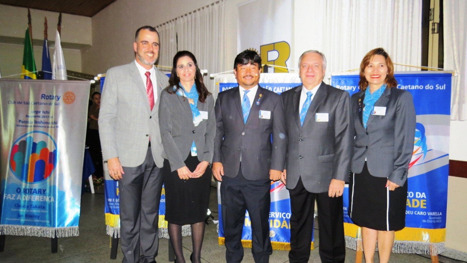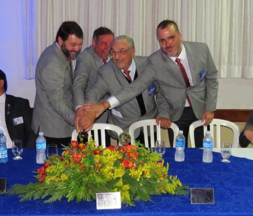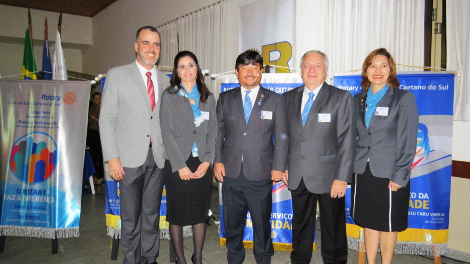 Em concorrida reunião festiva, realizada no Salão Nobre da Casa da Amizade de São Caetano do Sul, na noite do último dia 24 de junho de 2017 , mais de 150 pessoas, entre rotarianos e convidados, prestigiaram o evento, onde ocorreu a transmissão de cargo dos 4 presidentes dos Rotary Clubs de São Caetano do Sul. Com a presença do casal governador do Distrito 4420, Marie e Cláudio Hiroshi Takata, os presidentes humanitários, gestão 2016-2017, Alessandro Arnoni (R.C. São Caetano do Sul), Alarico Suhaldonik (R.C. S.C.Sul Oeste), Marcos Viola (R.C. S.C.Sul Leste) e Rodrigo Feola (R.C. S.C.Sul Olímpico), transmitiram o cargo de presidentes, respectivamente, para Jorge Ishi, Sandra Scarpin, Donizeti Moretti e Rodrigo Feola (que continua no cargo no R.C. S.C.Sul Olímpico), para gerirem seus clubes no ano rotário 2017-2018, seguindo o novo lema rotário 2017-2018, O ROTARY FAZ A DIFERENÇA. Na ocasião, discursou em nome dos novos presidentes, Jorge Ishi, do Rotary Club de São Caetano do Sul, parabenizando os presidentes humanitários 2016-2017 pela brilhante gestão e pelos grandes feitos realizados em prol da comunidade sulsancaetanense. O Governador do Distrito 4420 do Rotary International (que abrange os Rotary Clubs situados na região sul da cidade de São Paulo; os Rotary Clubs da região do Grande ABC e da baixada santista), Cláudio Hiroshi Takata e sua esposa Maria (ambos associados ao Rotary Club de São Paulo Aeroporto), em seu discurso de encerramento, parabenizou os presidentes dos Rotary Clubs de São Caetano do Sul, pelos feitos no ano rotário 2016-2017 e destacou algumas metas para o ano rotário 2017-2018 e agradeceu a presença de muitos outros presidentes de Rotary Clubs do Distrito 4420 que prestigiaram essa festiva. Encerrando sua fala, Cláudio Takata lembrou a importância dos Rotary Clubs de São Caetano do Sul, solicitando que todos os rotarianos continuem desempenhando seu papel de contribuir para um mundo melhor, auxiliando comunidades carentes e, especialmente nesse ano rotário, FAZENDO A DIFERENÇA, no que foi muito aplaudido ao final de sua fala. Encerrando a parte protocolar, os presidentes 2016-2017 deram juntos, a última badalada no sino rotário e na sequencia os presidentes 2017-2018 deram, também juntos, a primeira badalada no sino e partiram para a troca dos banners de suas gestões. Encerrando o evento, foi servido aos presentes um delicioso jantar, seguido de um café colonial, coroando mais um evento rotário, com muito companheirismo e amizade.