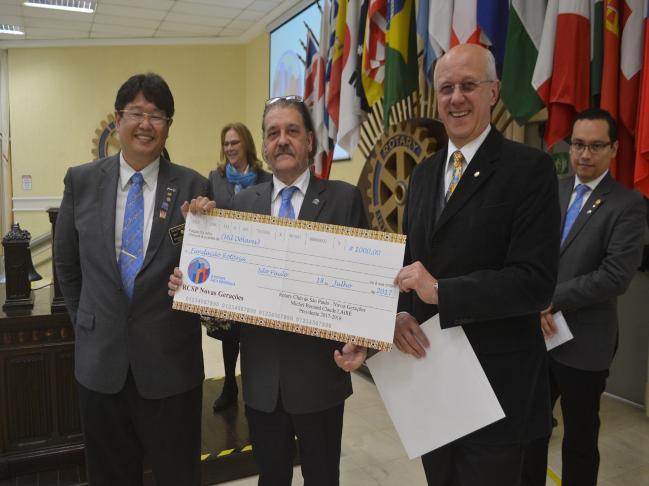 O novo Presidente Michel Bernard Claude LAIRÉ do RC SP Novas Gerações tomou posse junto ao seu Conselho Diretor do ano rotário 2017-18. O evento aconteceu no dia 18 de Julho de 2017, no Salão Nobre do Colégio Rio Branco com a presença do Governador Claudio Takata, sua esposa Marie Takata e várias autoridades rotárias. Aproveitando a presença do Curador da Fundação Rotária 2015-2019, Mario Cesar Martins de Camargo, em nome do club, um cheque de US$: 1000,00 foi entregue para a Fundação.