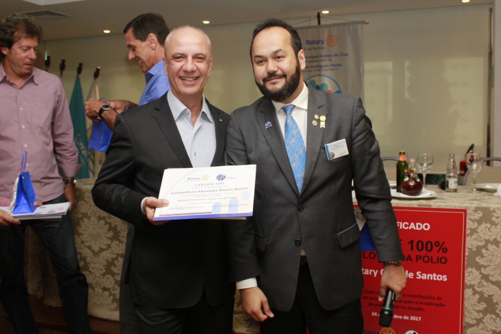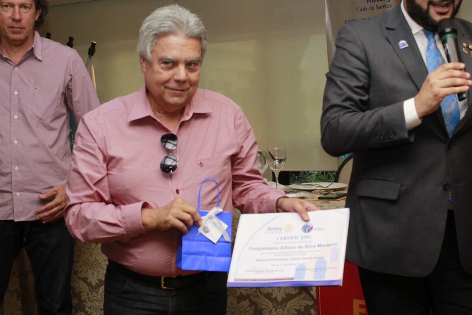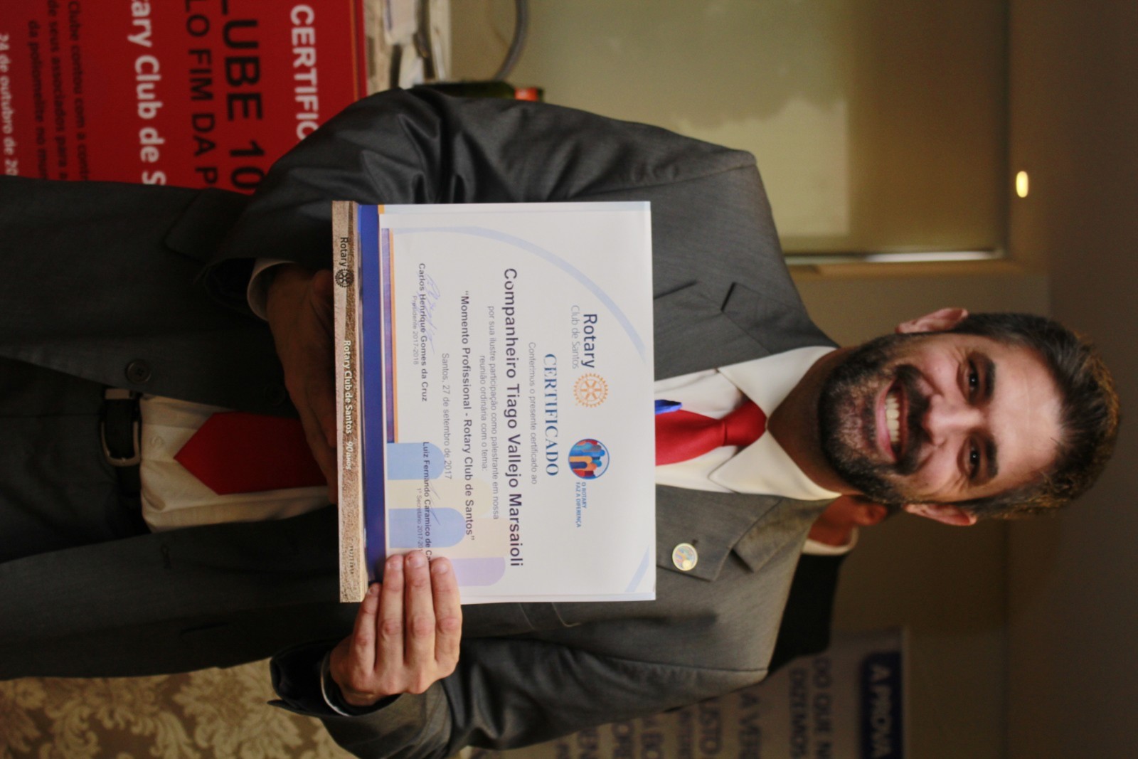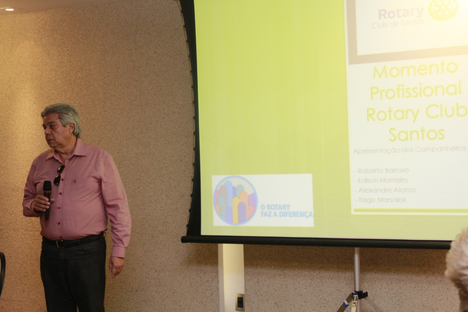 Em outro momento, foi iniciada a palestra da reunião e o tema foi: Momento Profissional ? Rotary Club de Santos e os Companheiros Alexandre Ribeiro Alonso, Edison da Silva Monteiro, Roberto Luiz Barroso Filho e Tiago Vallejo Marsaioli, puderam apresentar a todos suas profissões. A ideia tem como objetivo trazer mais visibilidade e interação entre Companheiros, dando a todos a oportunidade de trocarem suas ideias e experiências profissionais.
