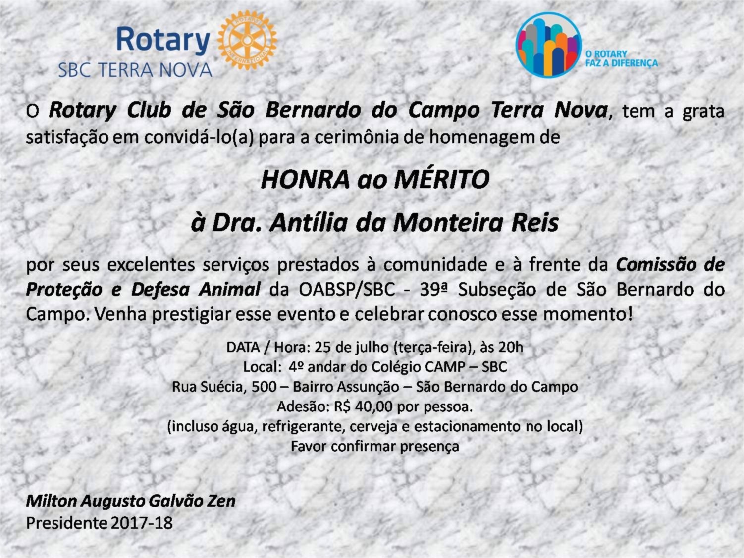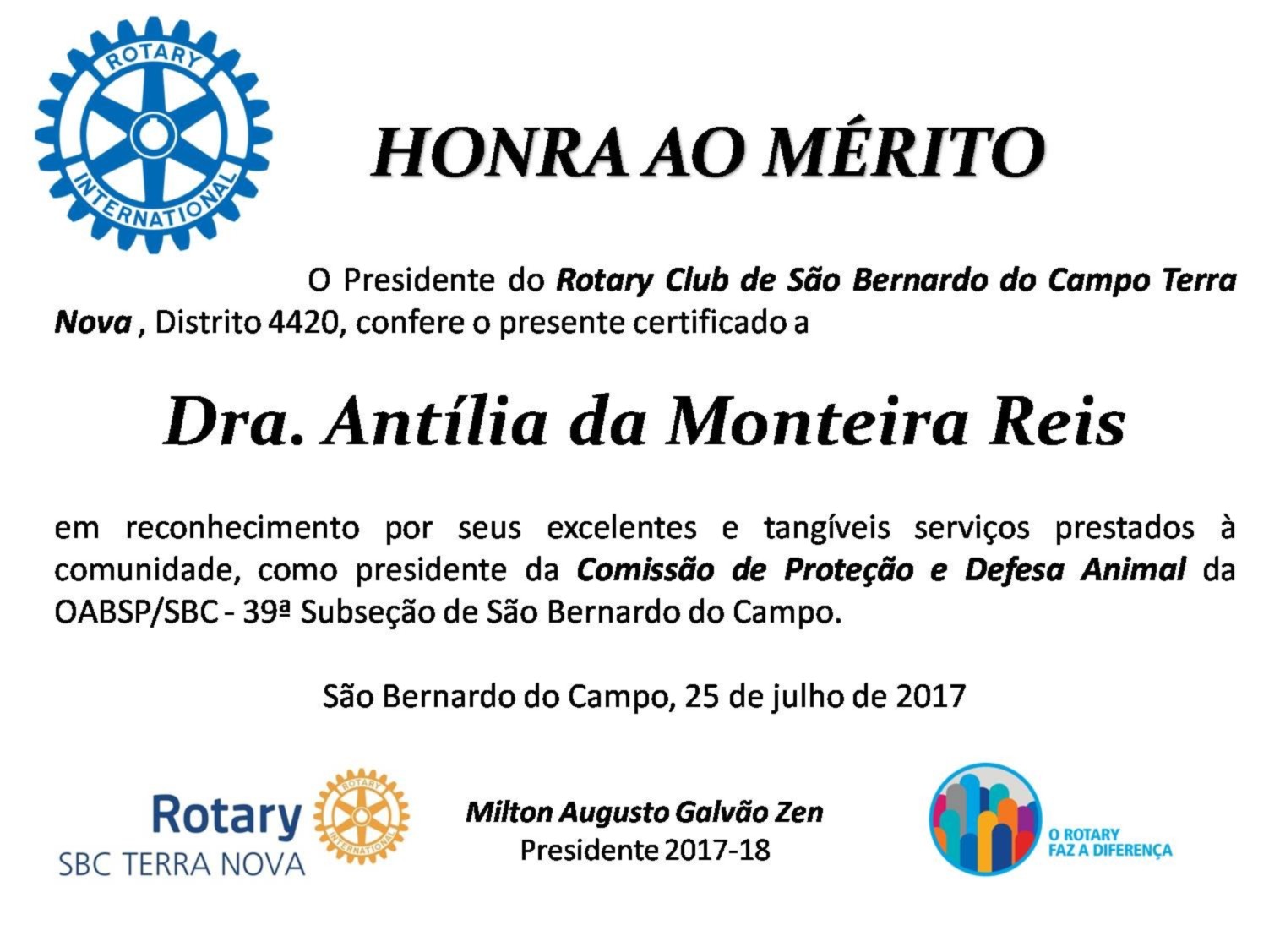 Foi com grande prazer que nós do RC SBC TERRA NOVA concedemos tal honraria à Dra. Antília.