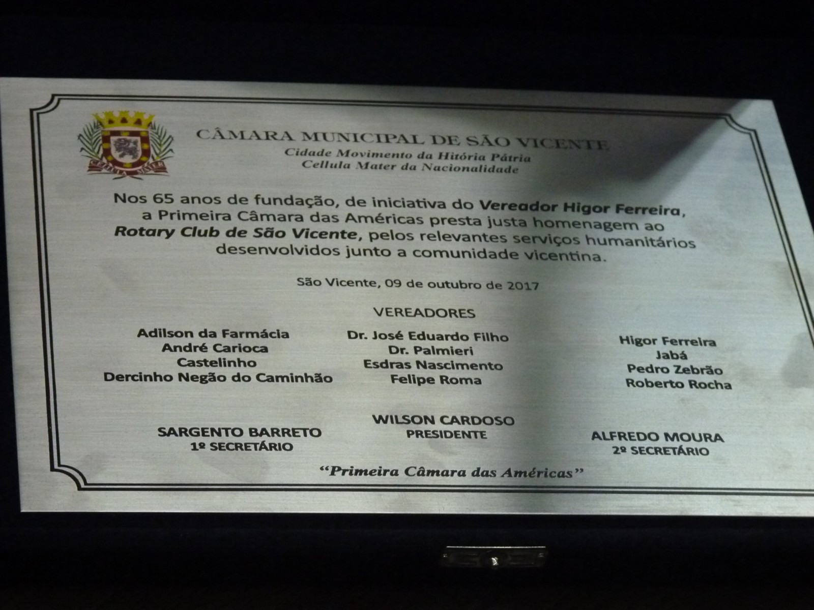 Em seguida, a equipe distrital seguiu para a Câmara Municipal de São Vicente, onde a presidente Julia Varandas recebeu uma homenagem pelos 65 anos de Fundação do Rotary Club São Vicente e serviços humanitários desenvolvidos junto à comunidade vicentina, de autoria do vereador e vice-presidente da Câmara, Higor Ferreira.