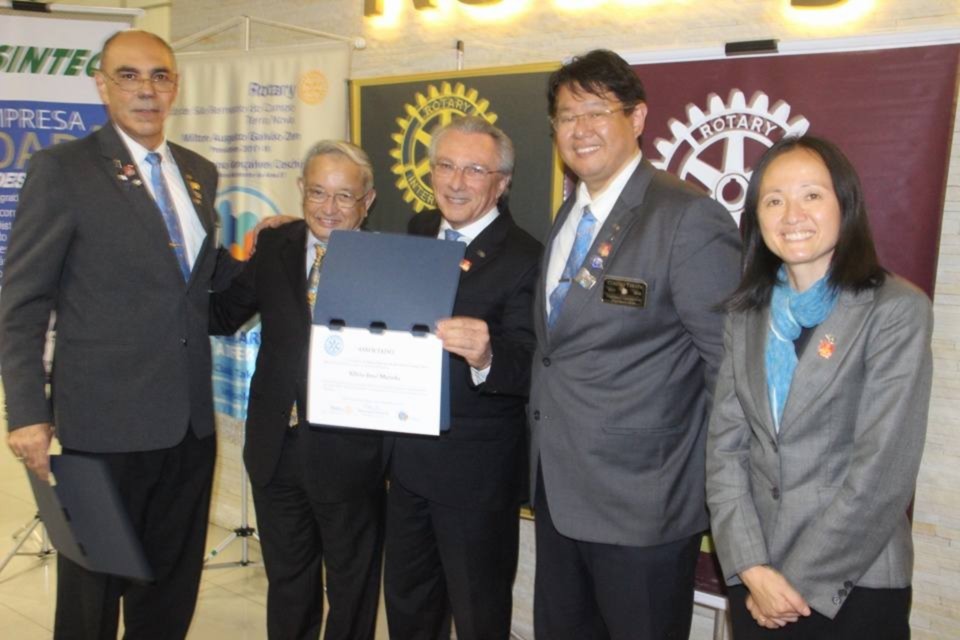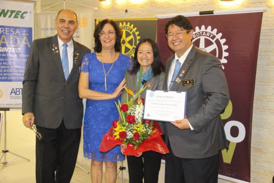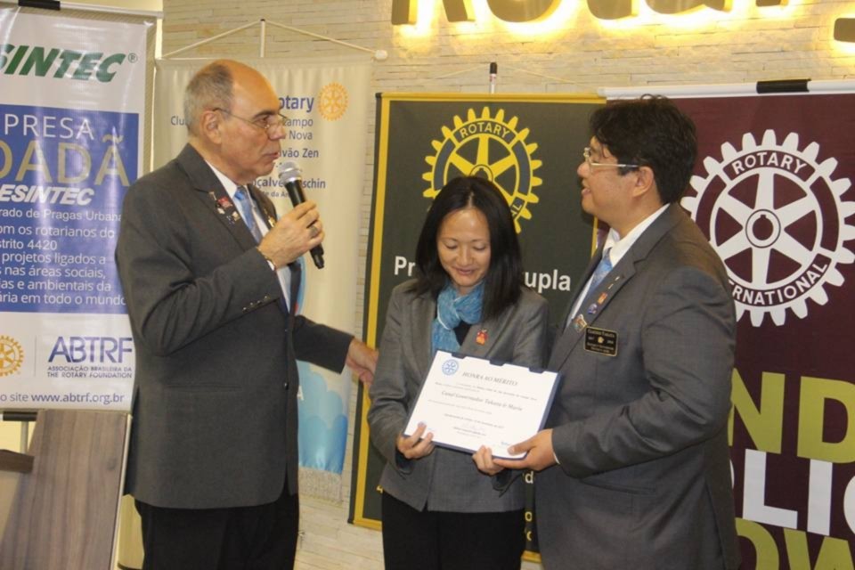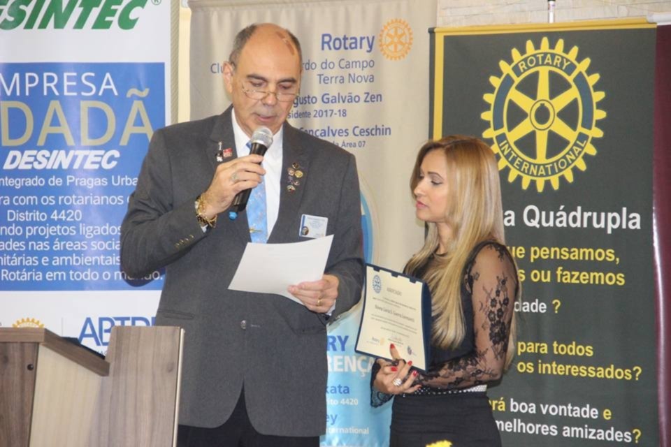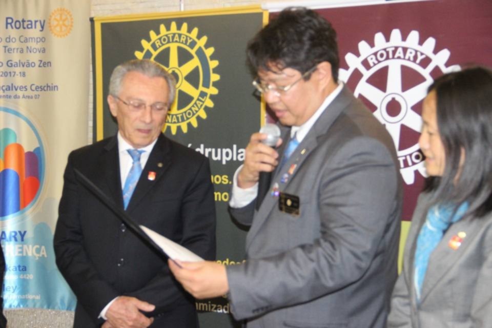 . Em momento especial, tivemos a oportunidade eu e o Governador Takata, de entregar a Honraria por Serviços Prestados à Comunidade, ao Prof. Dr. Ms. Valdir Cardoso de Souza, que emocionado agradeceu a oportunidade e sua felicidade em estar conosco no RC SBC TERRA NOVA.