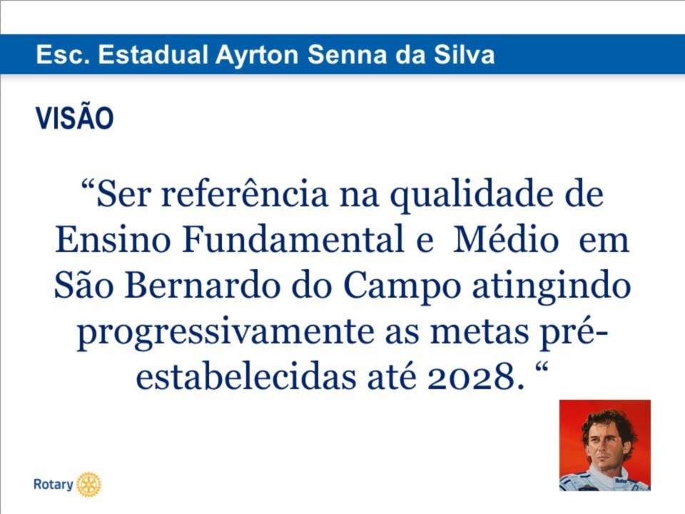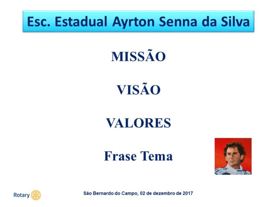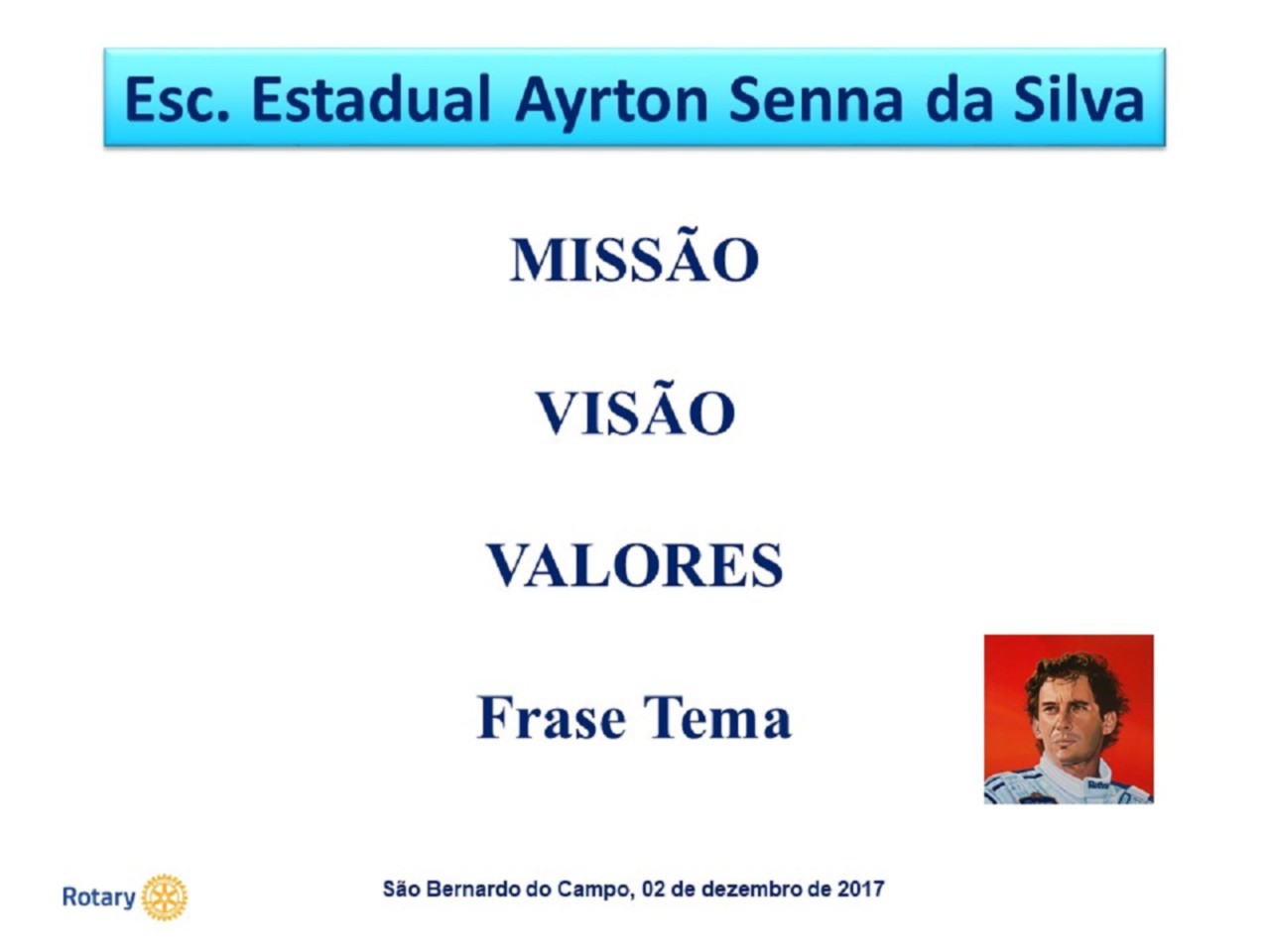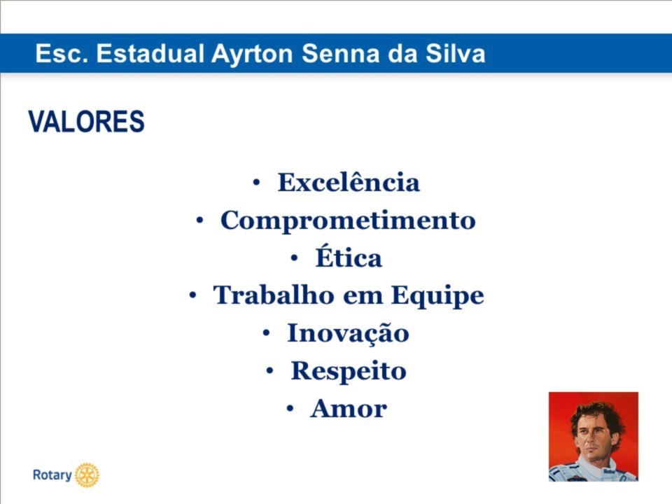 Um nome temos a zelar, o do próprio Rotary e também o do patrono da escola, AYRTON SENNA Da SILVA.