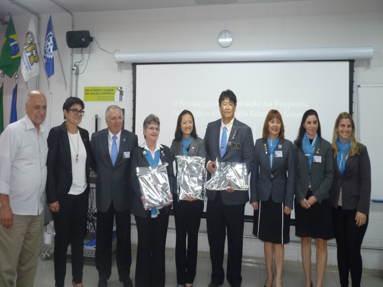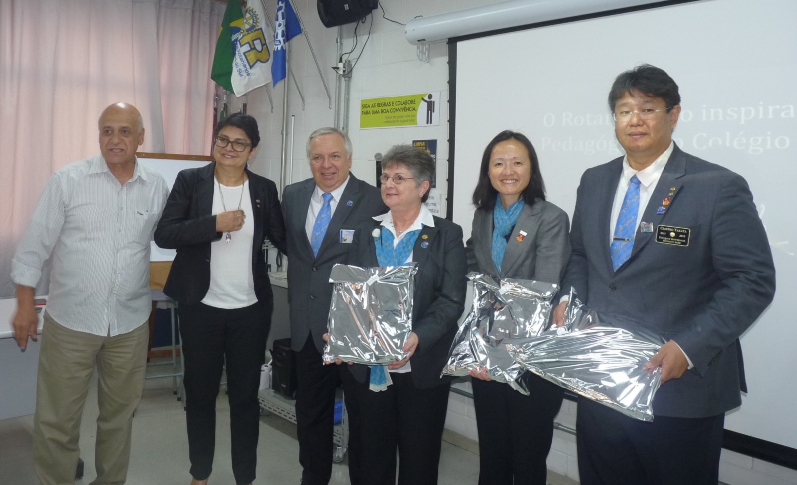 Em seu discurso, Claudio Takata reforçou sobre a continuidade dos trabalhos do Rotary International citando alguns valores sobre companheirismo, comprometimento, integridade, diversidade, liderança, entre outros. Ele parabenizou o projeto visitado, em especial pela estrutura oferecida aos alunos.