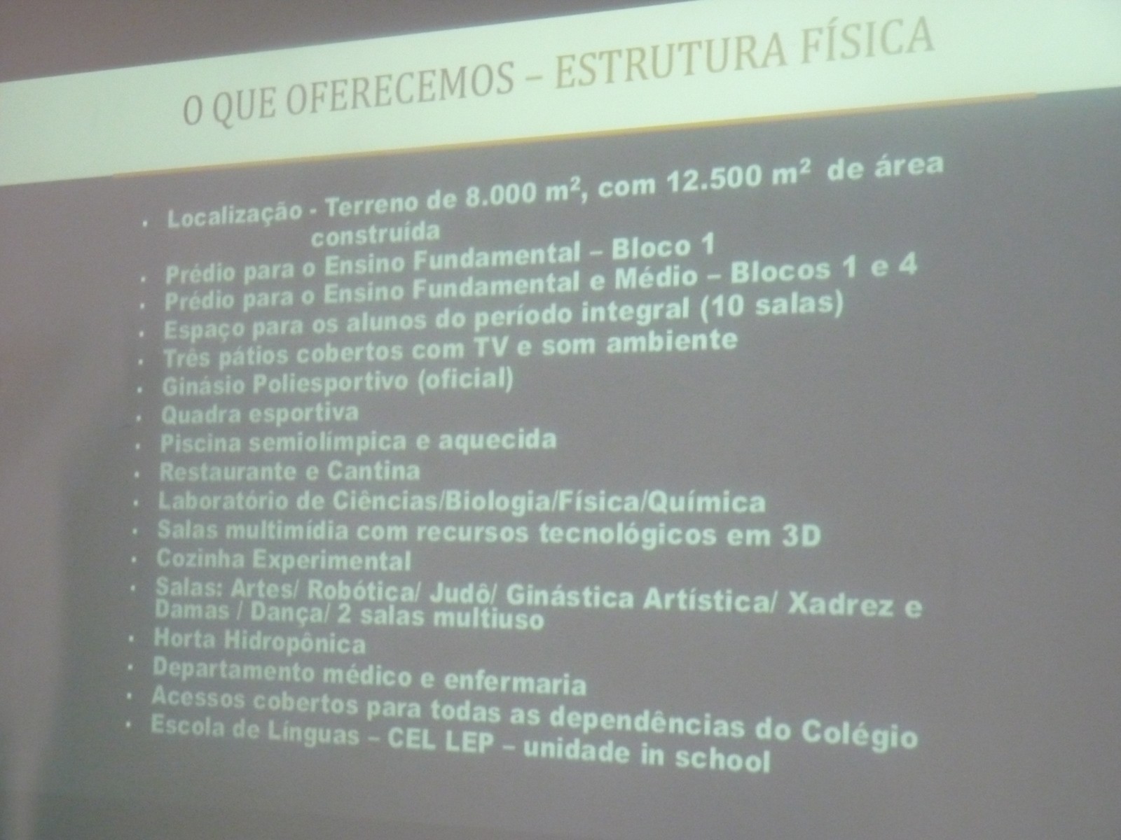 A escola tem parceiros como Sistema Anglo de Ensino, Escola de Línguas CeL Lep e Portal (acompanhamento escolar do aluno). Com uma área de 8000 metros quadrados, a instituição possuí salas de aula equipadas com lousas eletrônicas e acesso à internet, além de aplicativos pedagógicos 3D, notebooks com conteúdo digital de diversas disciplinas, laboratório de robótica, quadra poliesportiva (piso flutuante, padrão NBA), piscina semiolímpica aquecida, aulas de dança, judô, xadrez e damas, atendimento de primeiros socorros e uma equipe multidisciplinar com médico do esporte, pediatra, psicóloga do esporte, nutricionista e fisioterapeutas.