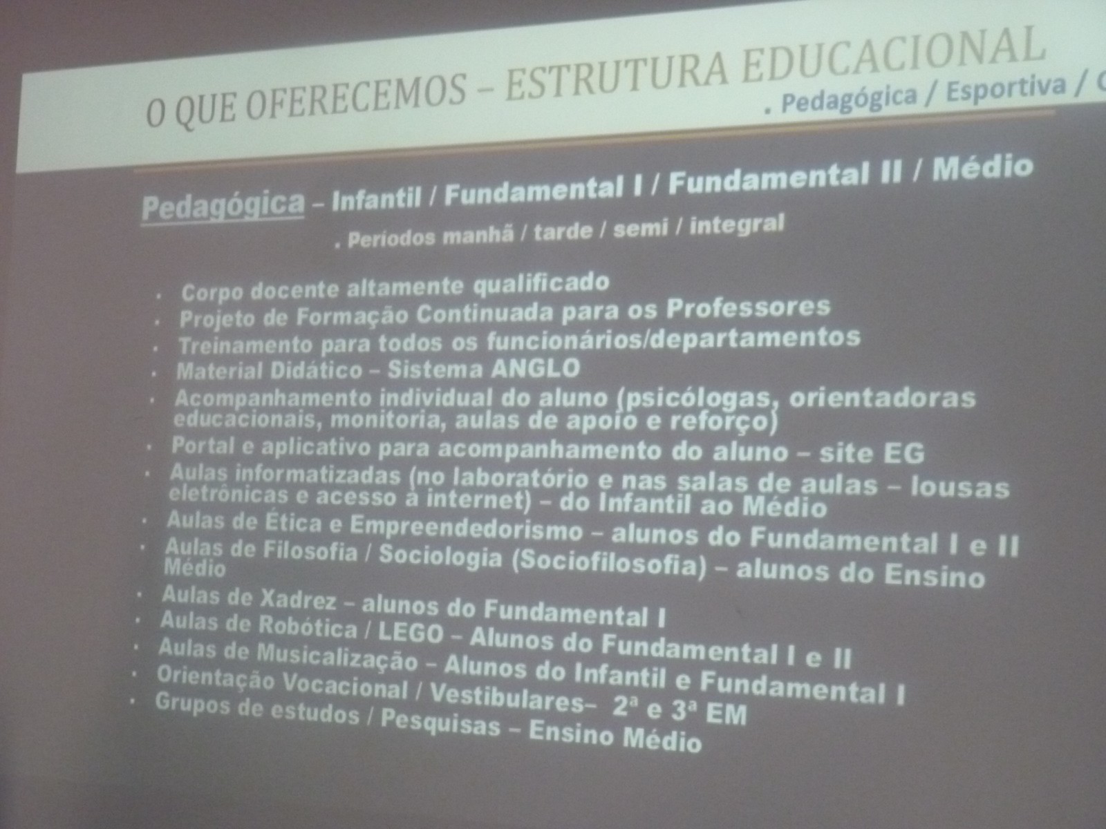 Tem aproximadamente 2.000 alunos nos cursos de Educação Infantil, Ensino Fundamental e Médio. Eles desenvolvem habilidades físicas e intelectuais, artísticas e recreativas, de acordo com cada fase de seu desenvolvimento. Os alunos estudam em períodos semi-integral e integral, com profissionais que orientam e supervisionam a rotina dos estudantes.