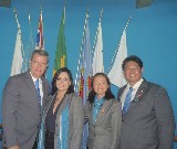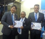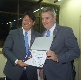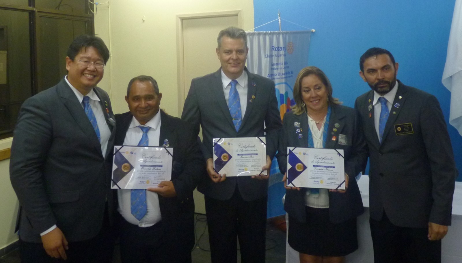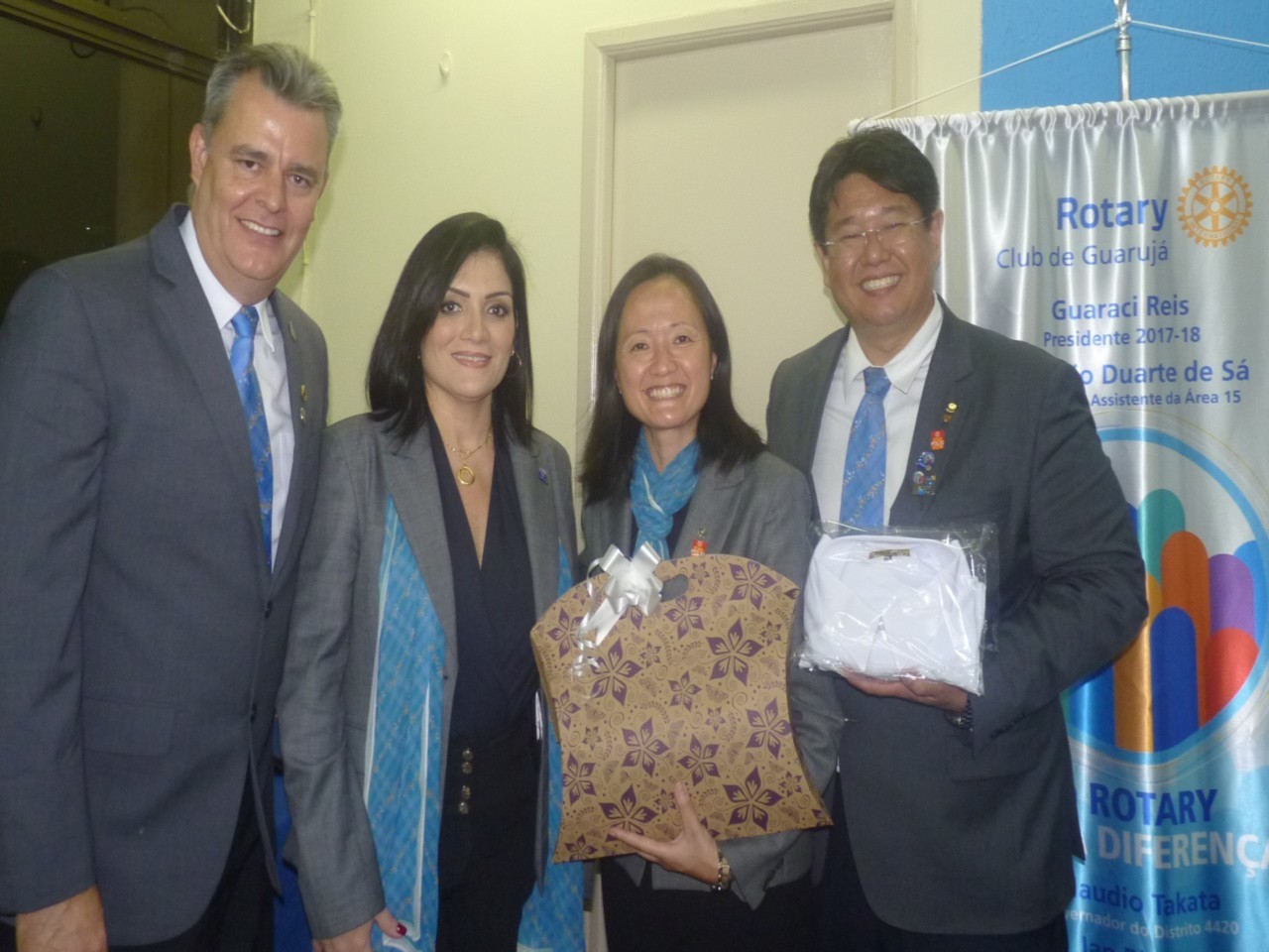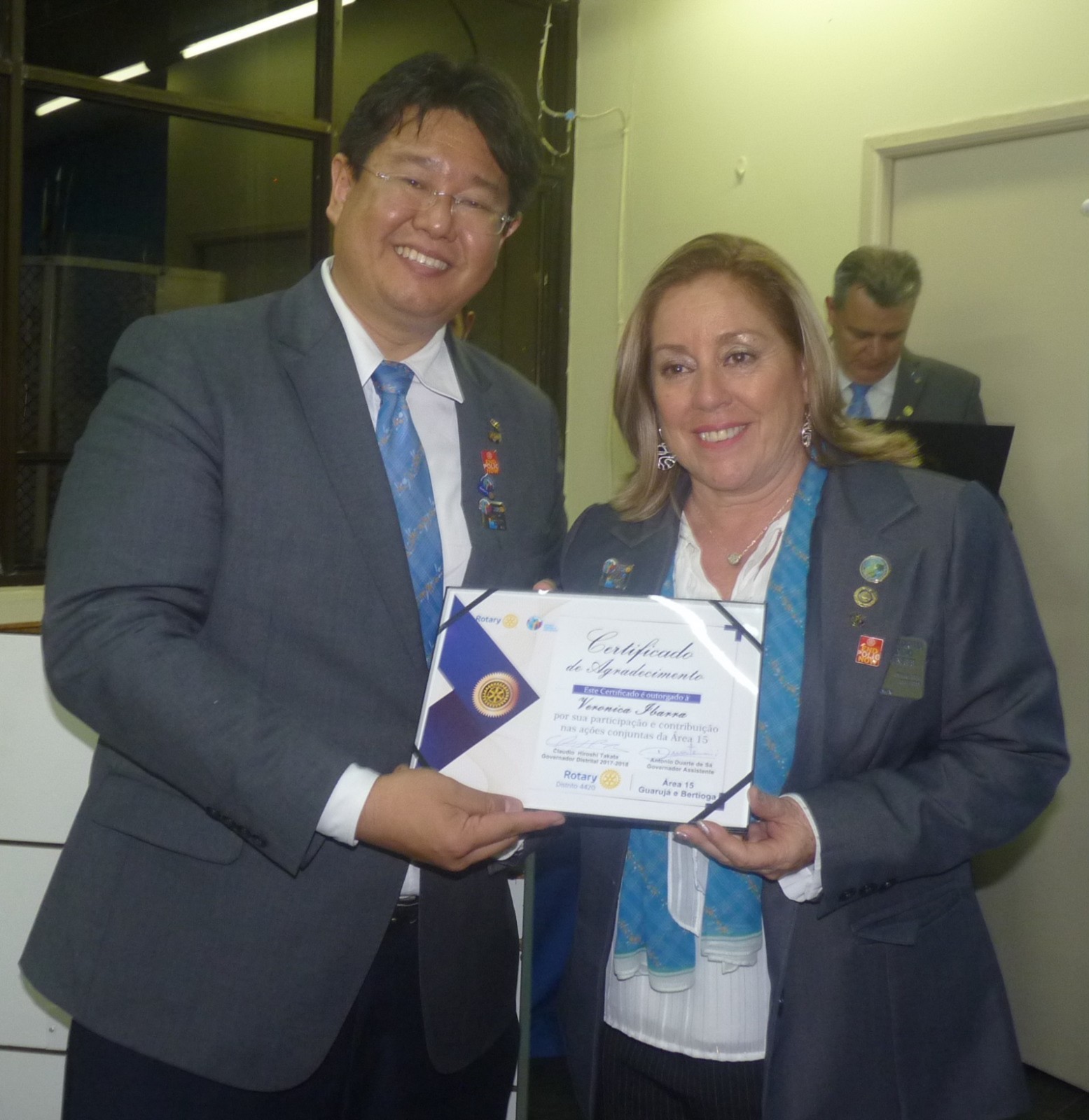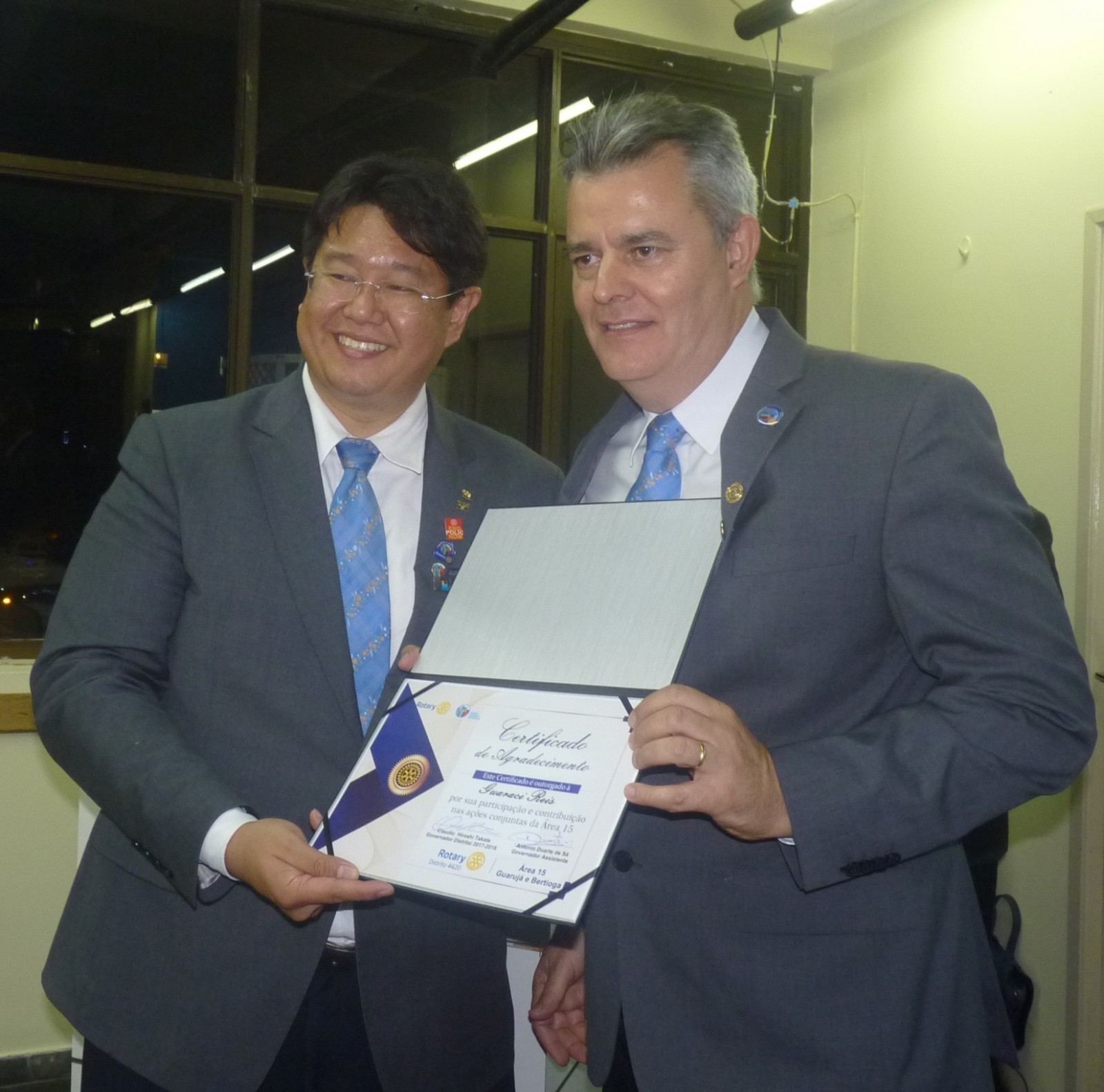 Takata entregou um certificado de agradecimento aos presidentes: Guaraci Reis - RC Guarujá, Veronica Ibarra ? RC Guarujá Vicente de Carvalho e Erivaldo Feitosa ? RC Bertioga Canal, pelas participações e contribuições nas ações conjuntas da área 15.