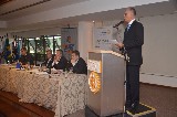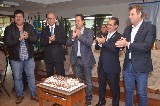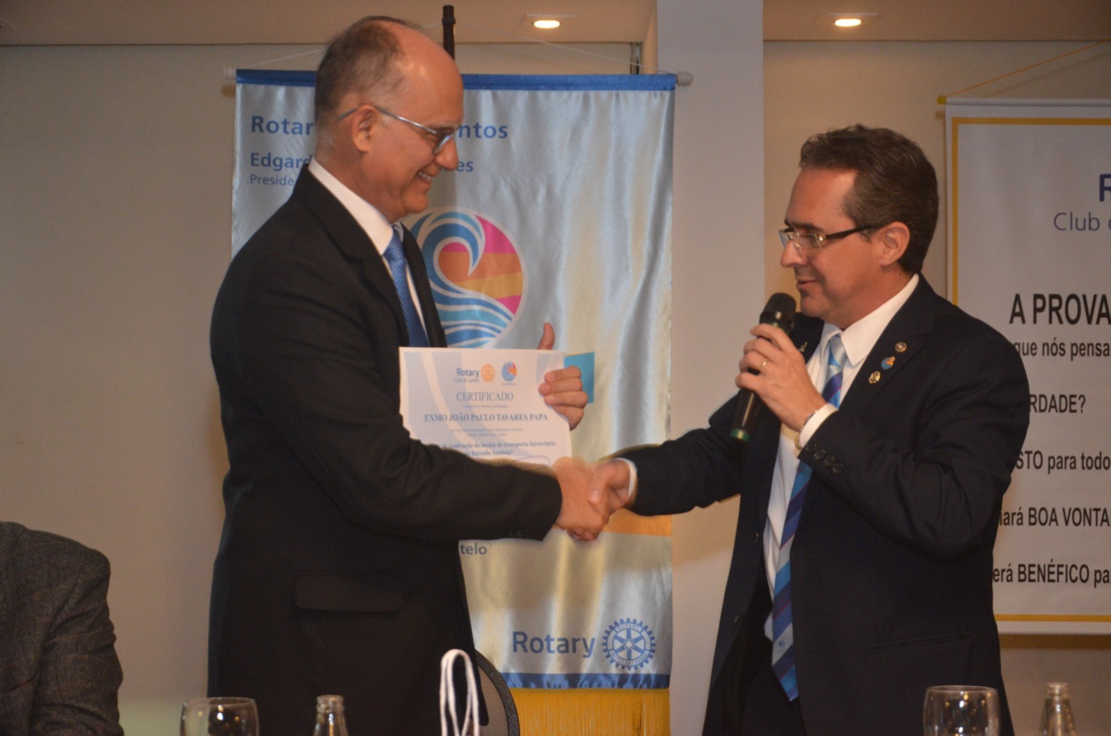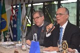 Apo#769;s a posse, foi dado inicio à palestra do Deputado Federal Joa#771;o Paulo Tavares Papa, com o tema Projeto de reativac#807;a#771;o do modal de transporte ferrovia#769;rio na Baixada Santista.