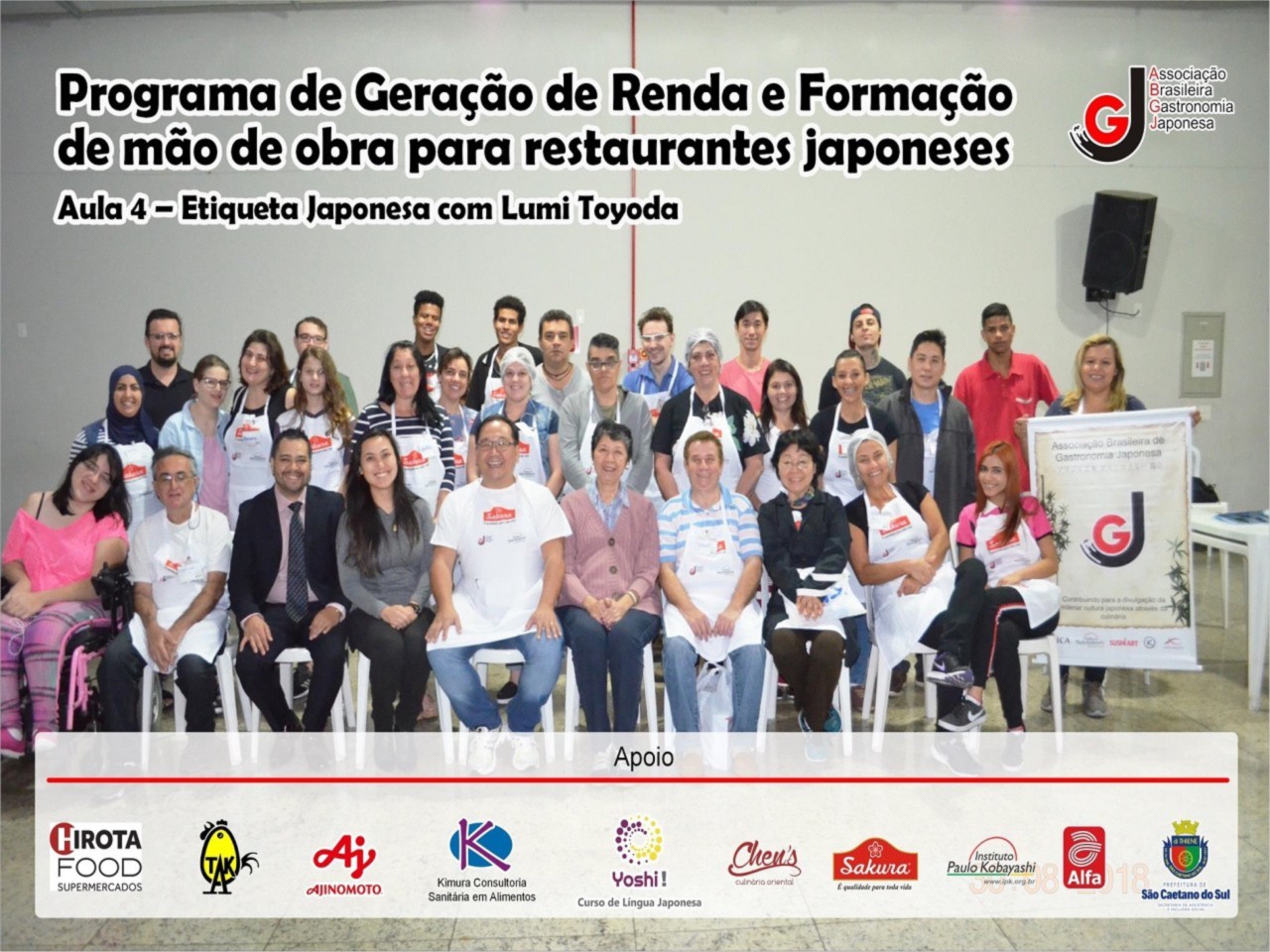 A companheira Lumi Toyoda do Rotary Club de São Caetano do Sul-Leste ministrou uma palestra sobre Etiqueta Japonesa no Programa de Geração de Renda e Formação de Mão de Obra para Restaurantes Japoneses, realizado pelo CRAS-Centro de Referência de Assistência Social e SEAIS-Secretaria de Assistência e Inclusão Social da Prefeitura Municipal de São Caetano do Sul. A atividade é voltada a munícipes cadastrados nos programas sociais da cidade que estão desempregados atualmente.